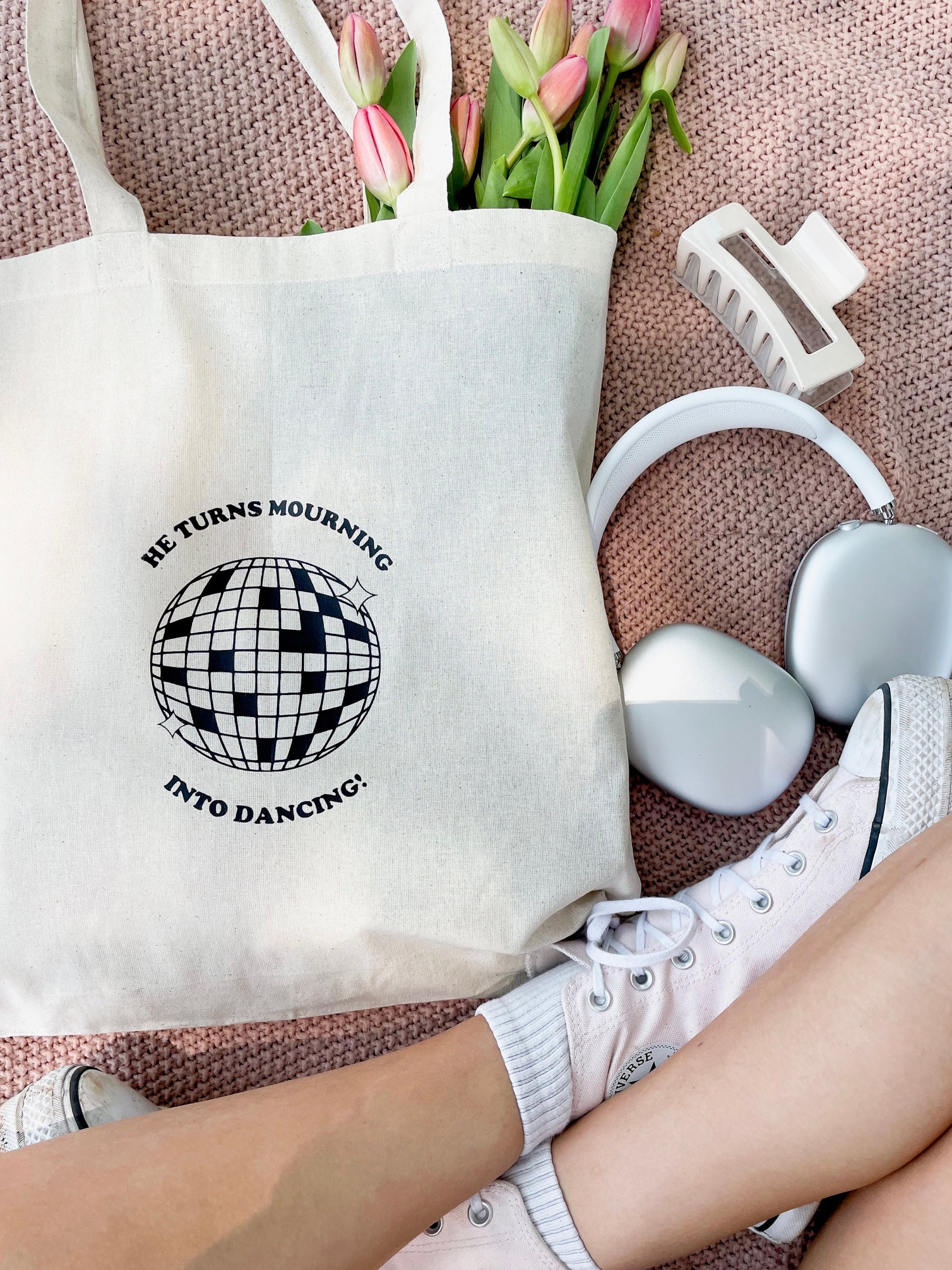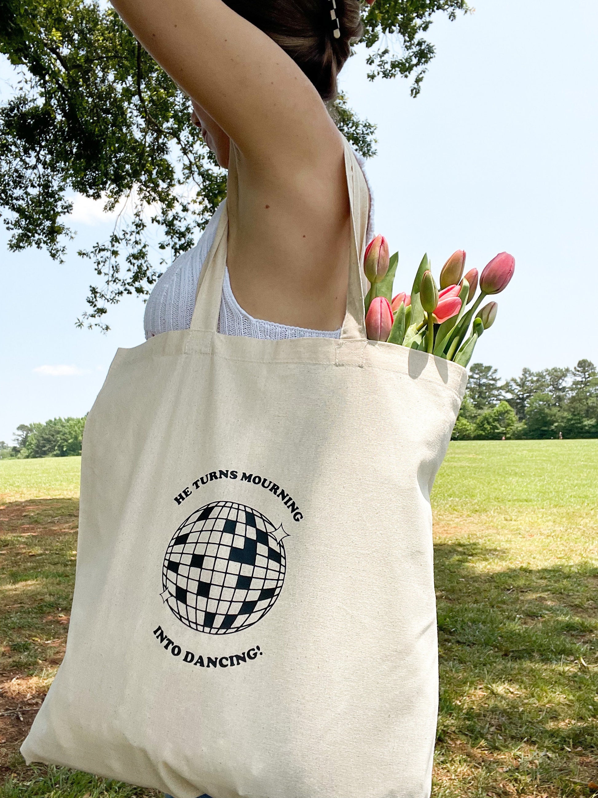 The “He Turns Mourning Into Dancing” tote. A daily reminder that God can bring beauty from sorrow - perfect for church, errands, or everyday use.