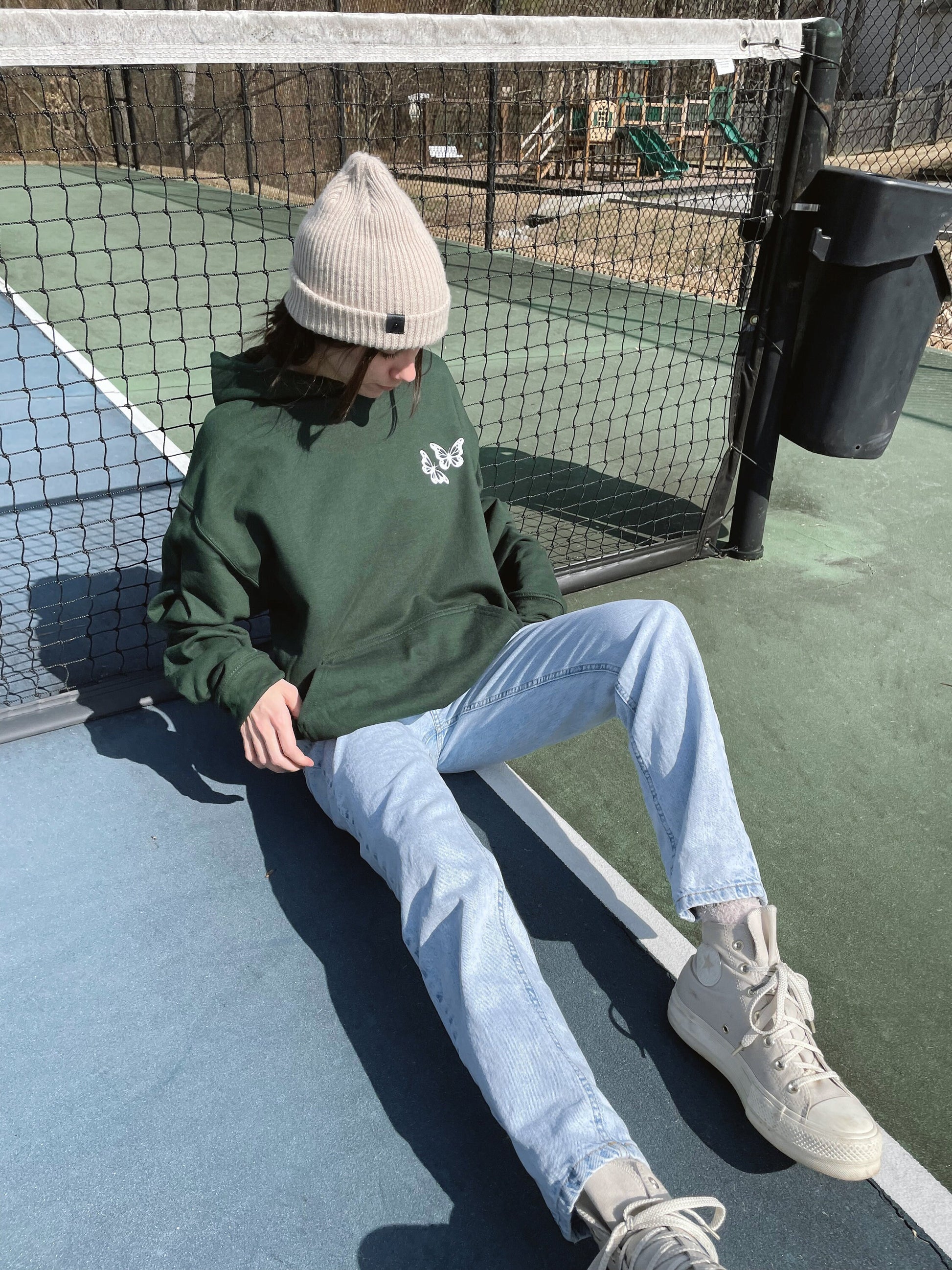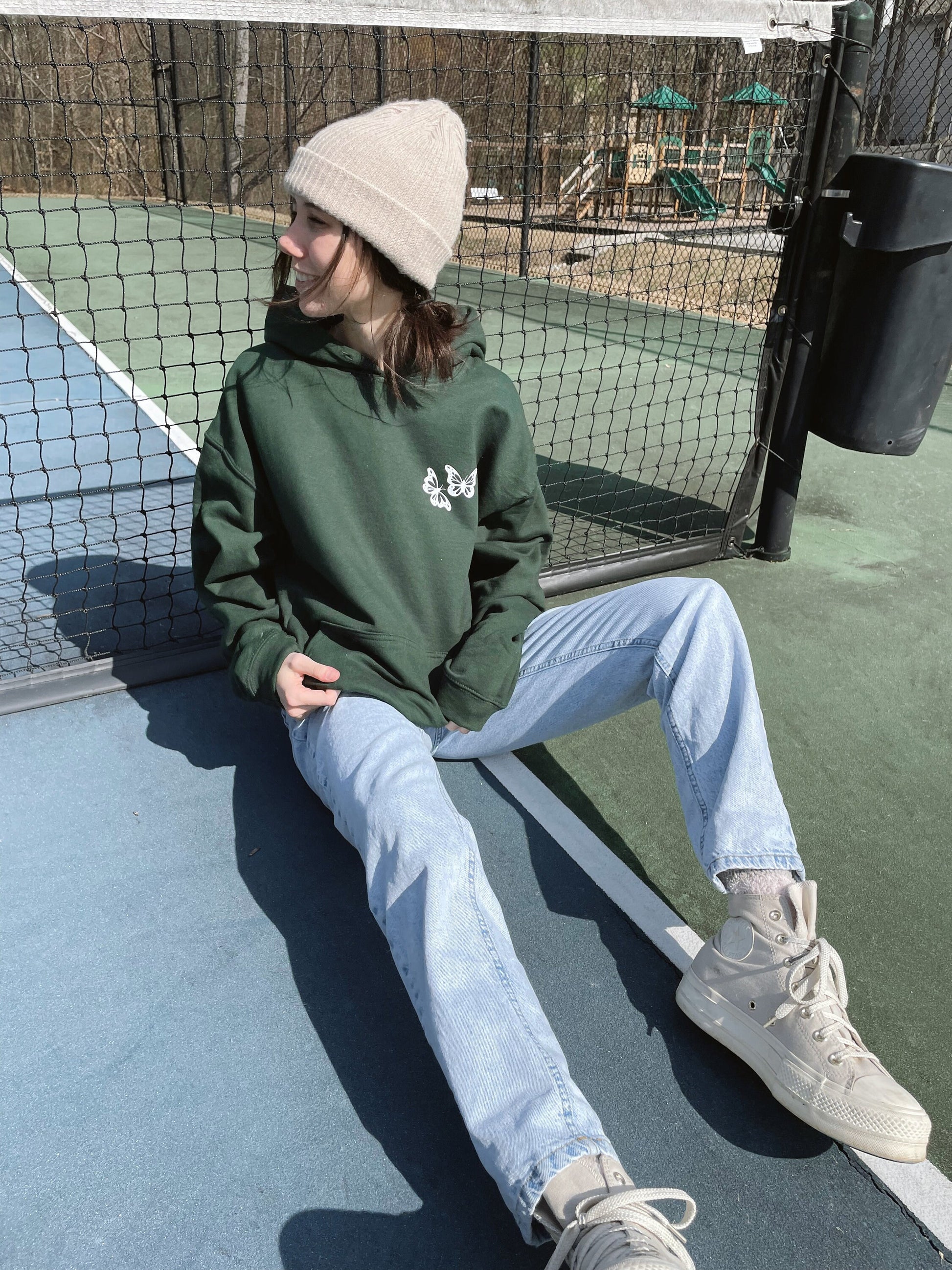 This hoodie is forest green - color may look different depending on lighting and filters in pictures.