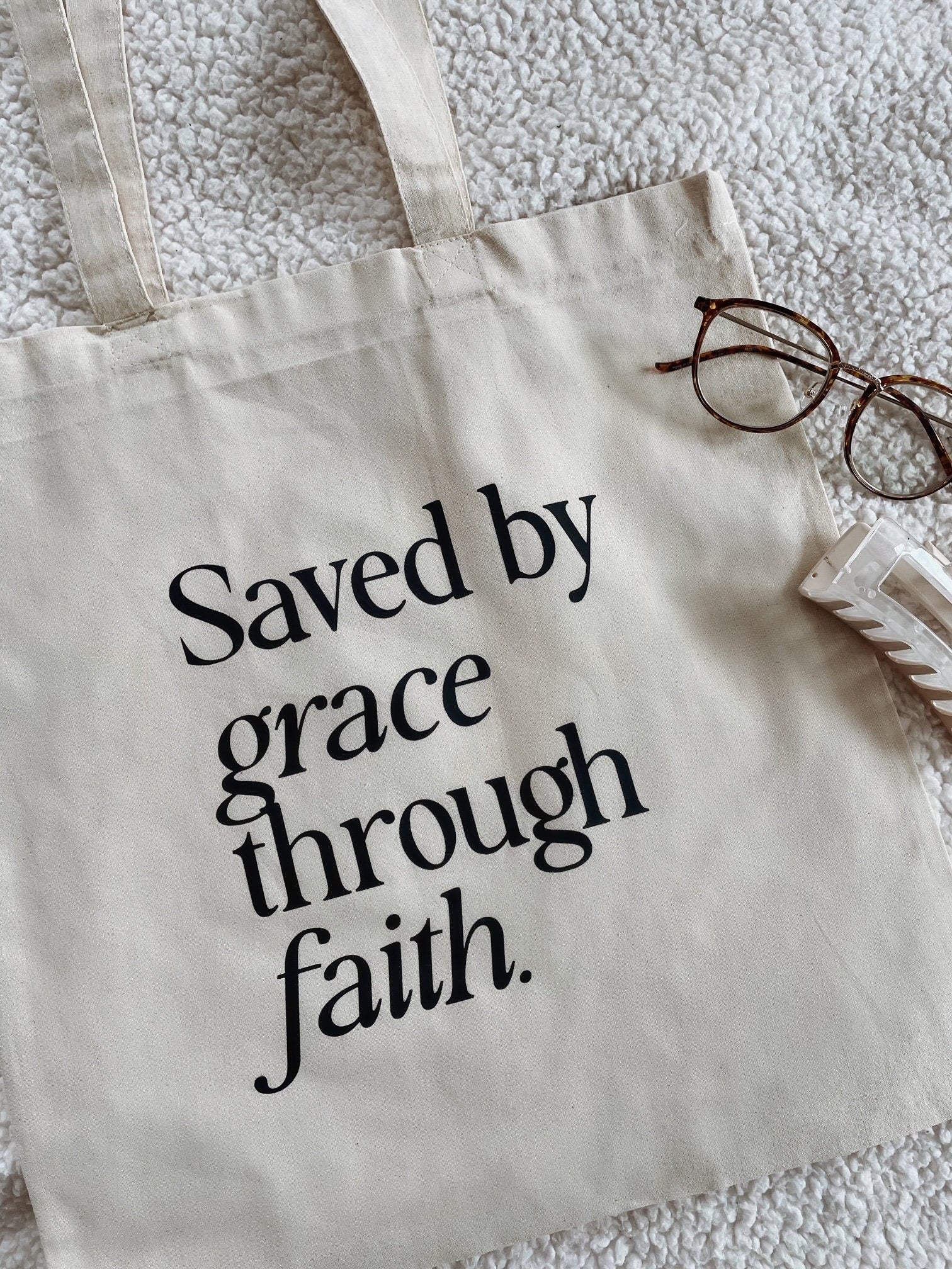 Saved by Grace Through Faith Tote Bag | Christian Tote | Bible Verse Tote | Faith Gift for Women Scripture Canvas Bag Minimal Christian Tote