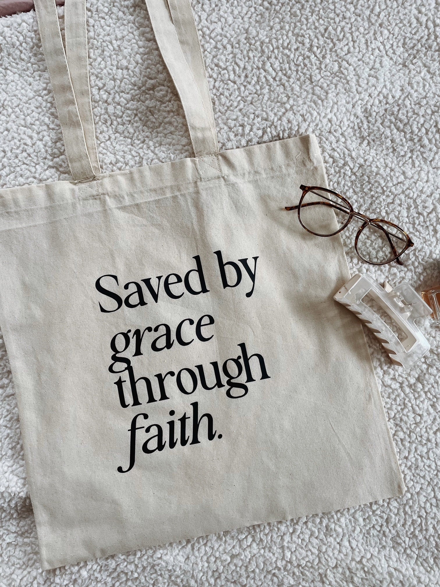 The “Saved by Grace Through Faith” tote - a timeless reminder of God’s unending grace and love. Simple, classic, and perfect for everyday use.
